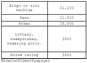 The chart below shows the minimum you must win to trigger a W-2G form from the following games.